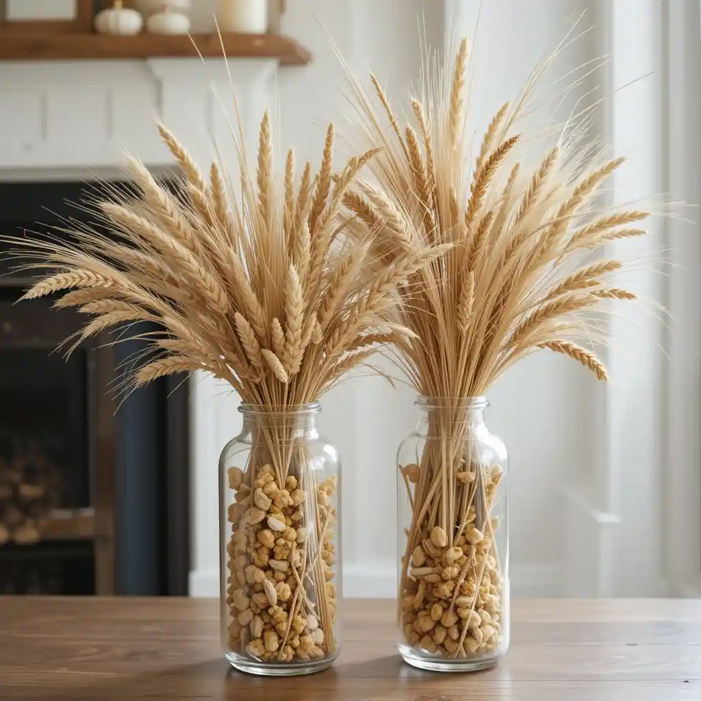 Tall vases filled with corn husks, wheat stalks, or dried grasses bring a natural and rustic look. They’re easy to set up and instantly create a farmhouse-style fall feel.