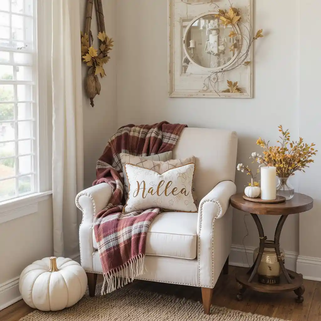 Create a cozy fall retreat with a soft chair, plaid blanket, and a side table with a candle. Adding a few fall-themed pillows completes the perfect autumn corner.