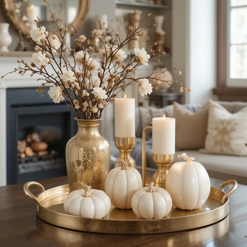 Gold or brass accents in vases, trays, or candle holders bring a warm glow to fall décor. They work beautifully with both rustic and modern themes.