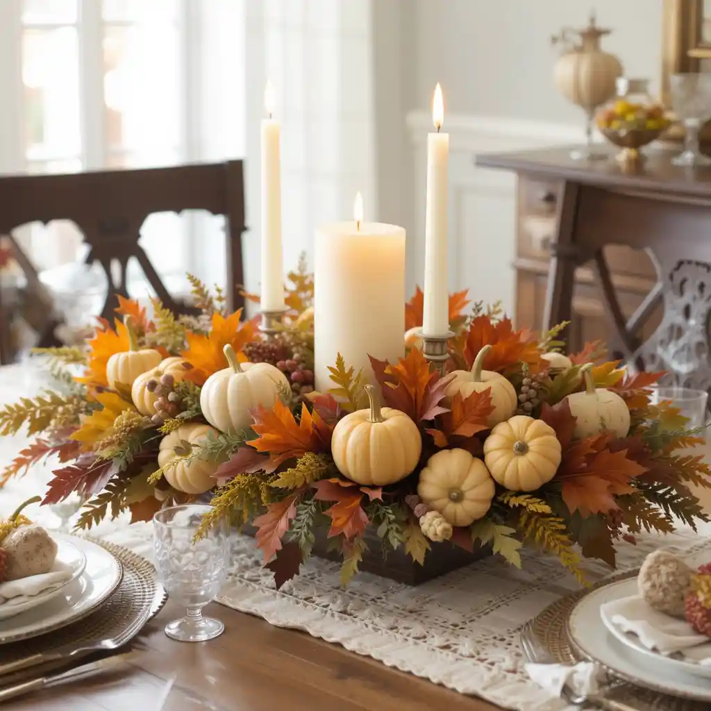 Create a stunning fall centerpiece using mini pumpkins, candles, and faux leaves. This adds elegance to your dining table while keeping the harvest spirit alive.