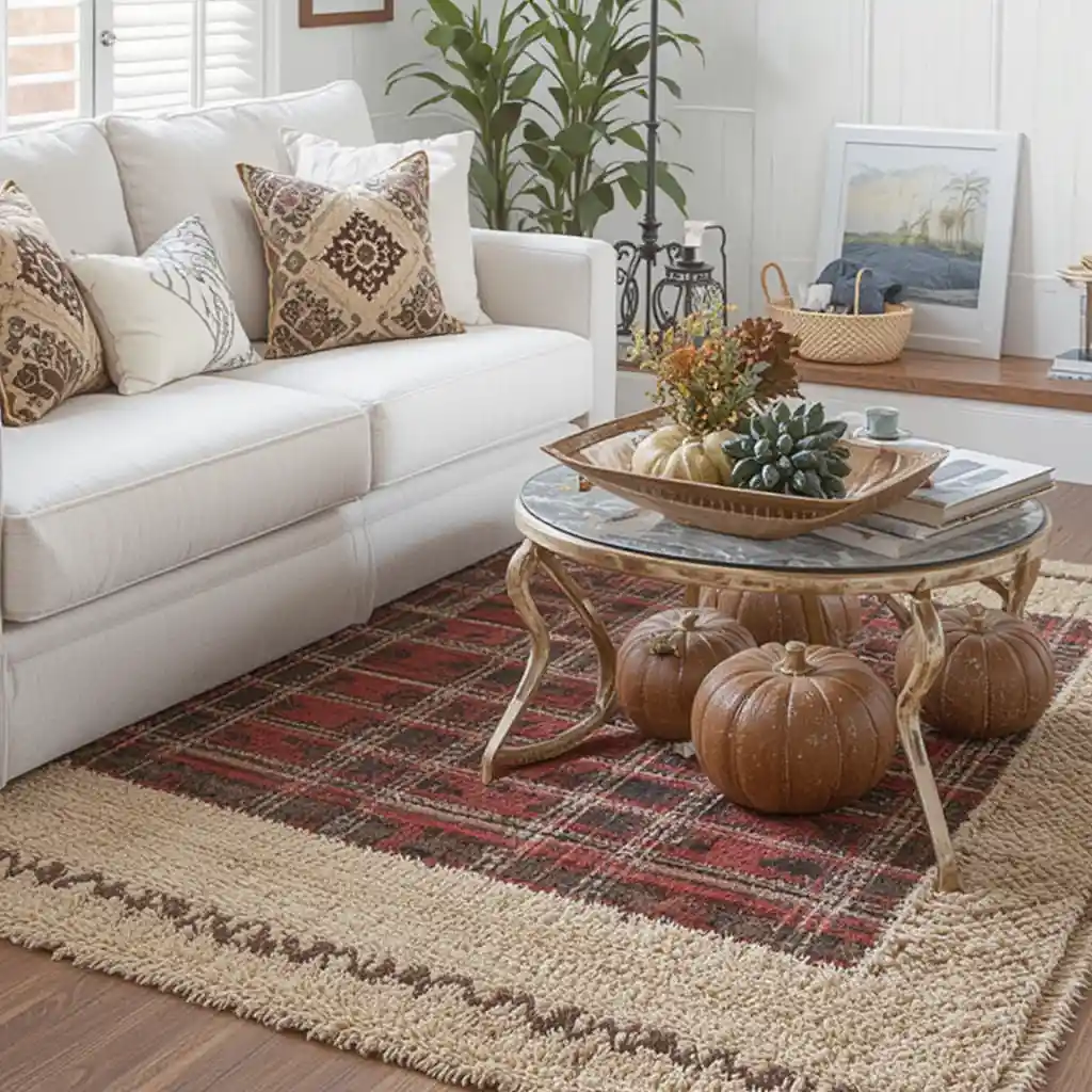 Placing a plaid or jute rug over a neutral base rug adds depth and seasonal flair. This layered look makes living rooms or entryways feel extra cozy.