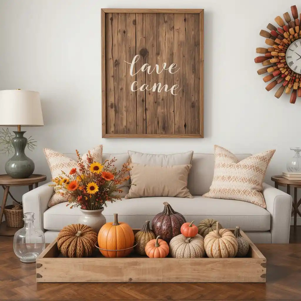 Incorporating wooden trays, bowls, or wall art creates a rustic farmhouse look that’s perfect for fall. Natural wood tones pair beautifully with autumn colors like burnt orange, mustard, and deep red.