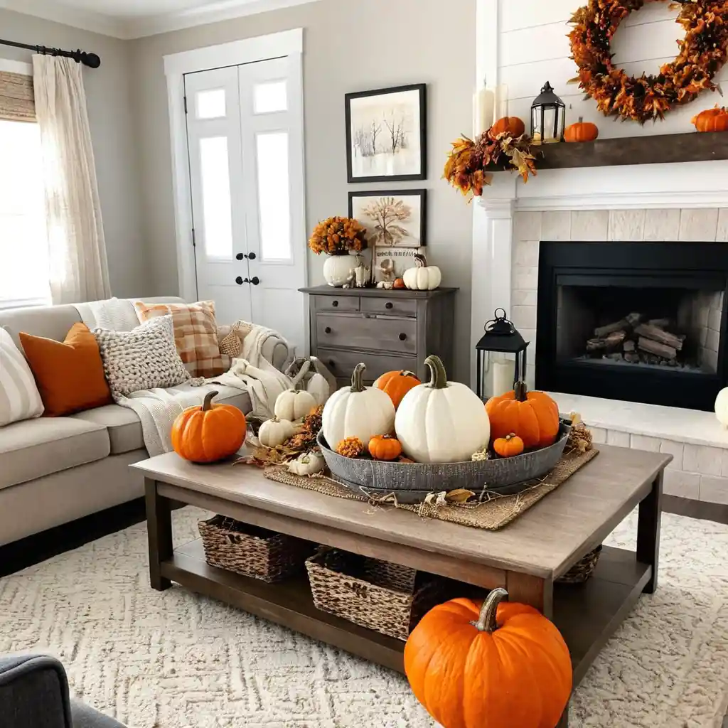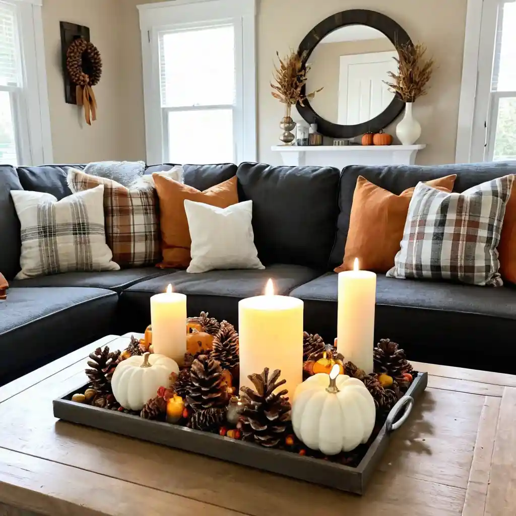 Combine candles, pinecones, pumpkins, and a rustic tray to create a seasonal focal point right in the heart of your living room.