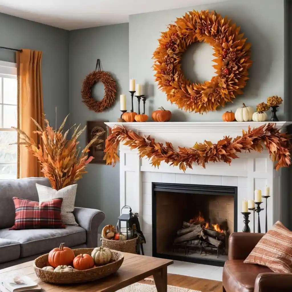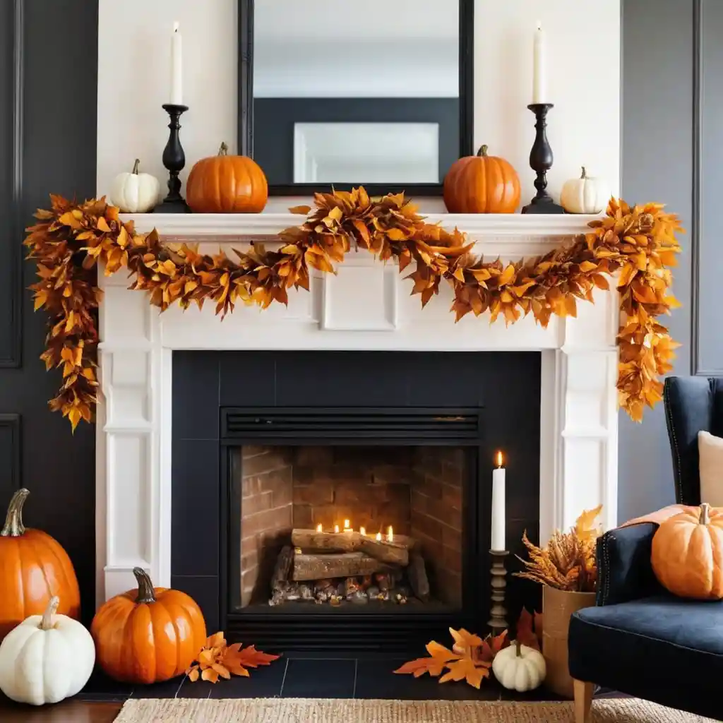 Dress up your fireplace with garlands of leaves, pumpkins, and candles. It creates a cozy focal point and enhances the seasonal mood.