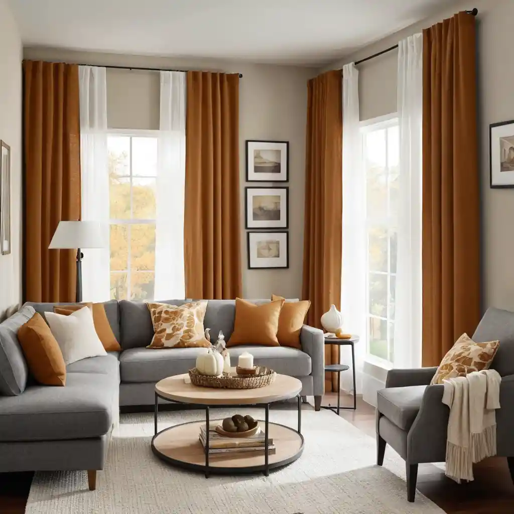 Switch airy summer curtains for heavier ones in deeper tones. They add coziness, warmth, and create a layered fall living room look.