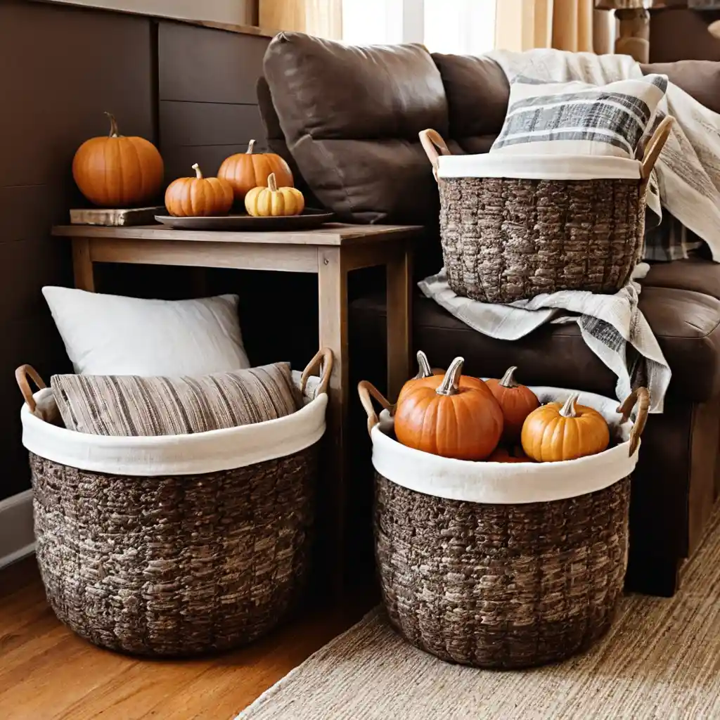 Woven baskets filled with extra blankets, pillows, or even logs give your living room both function and rustic autumn charm.