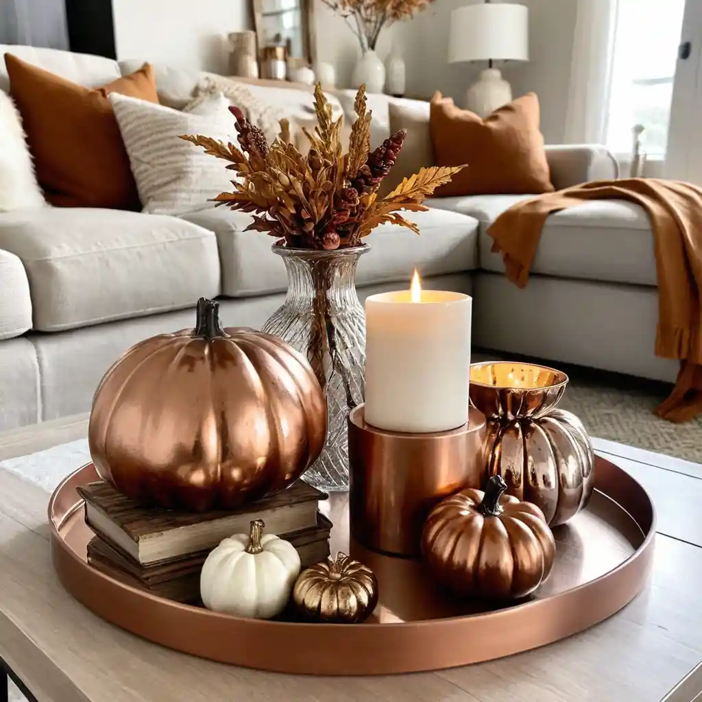 Gold, bronze, or copper decor pieces such as candle holders, trays, and vases add warmth and shine, perfectly complementing fall colors.