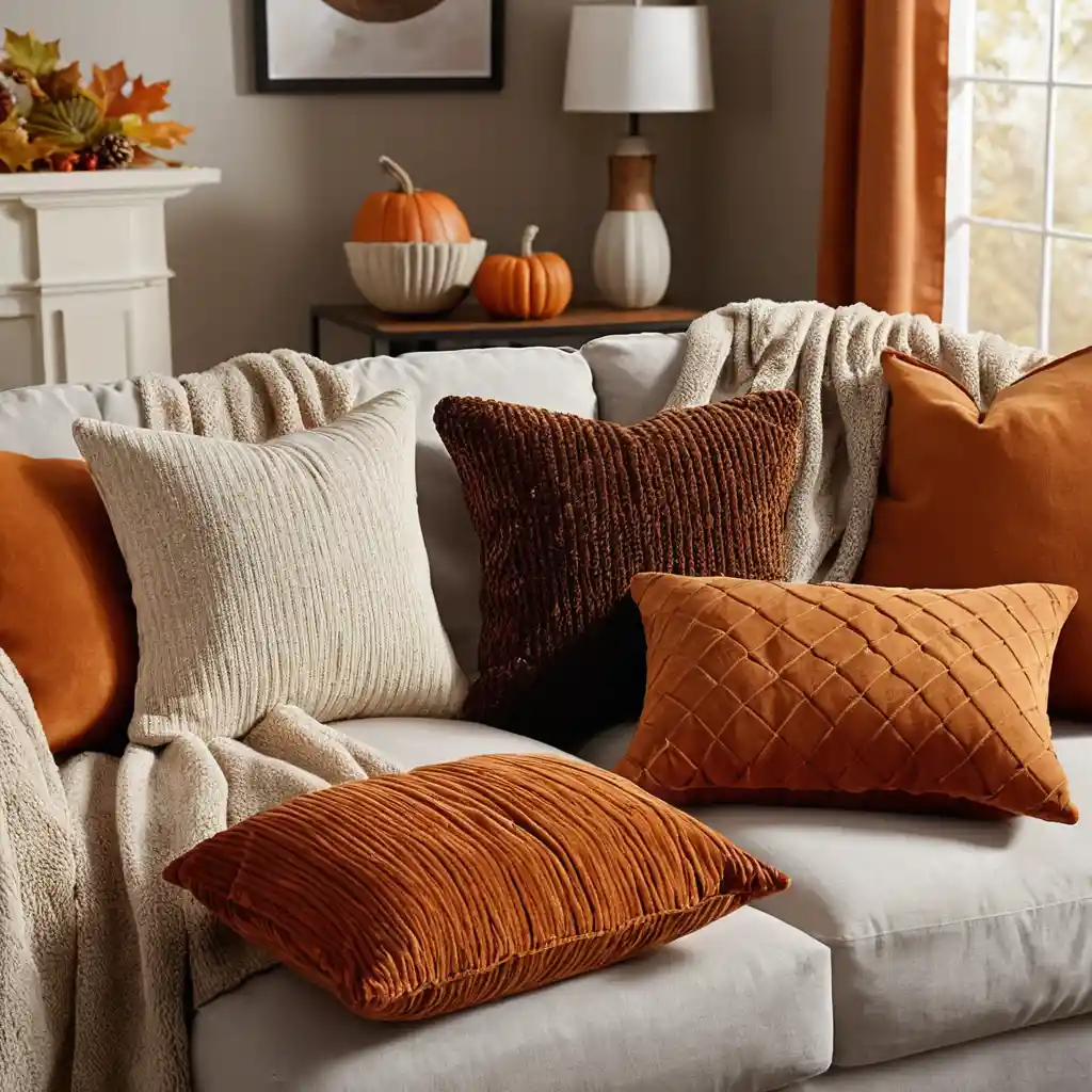 Switch out lightweight summer cushions for plush fall pillows with textures like corduroy, faux fur, or embroidered autumn designs.
