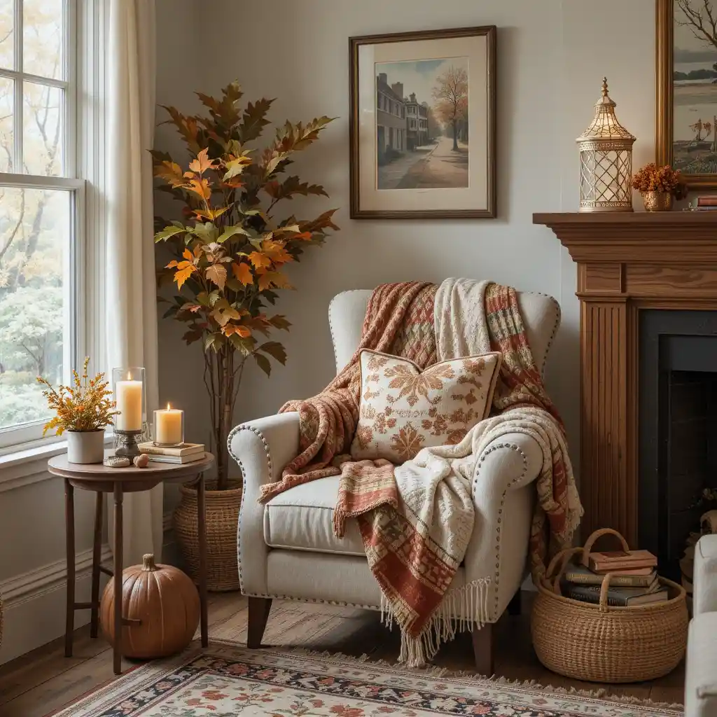 Add a comfy chair, layered throws, and a side table with a fall-scented candle to create a peaceful autumn reading corner in your living room.