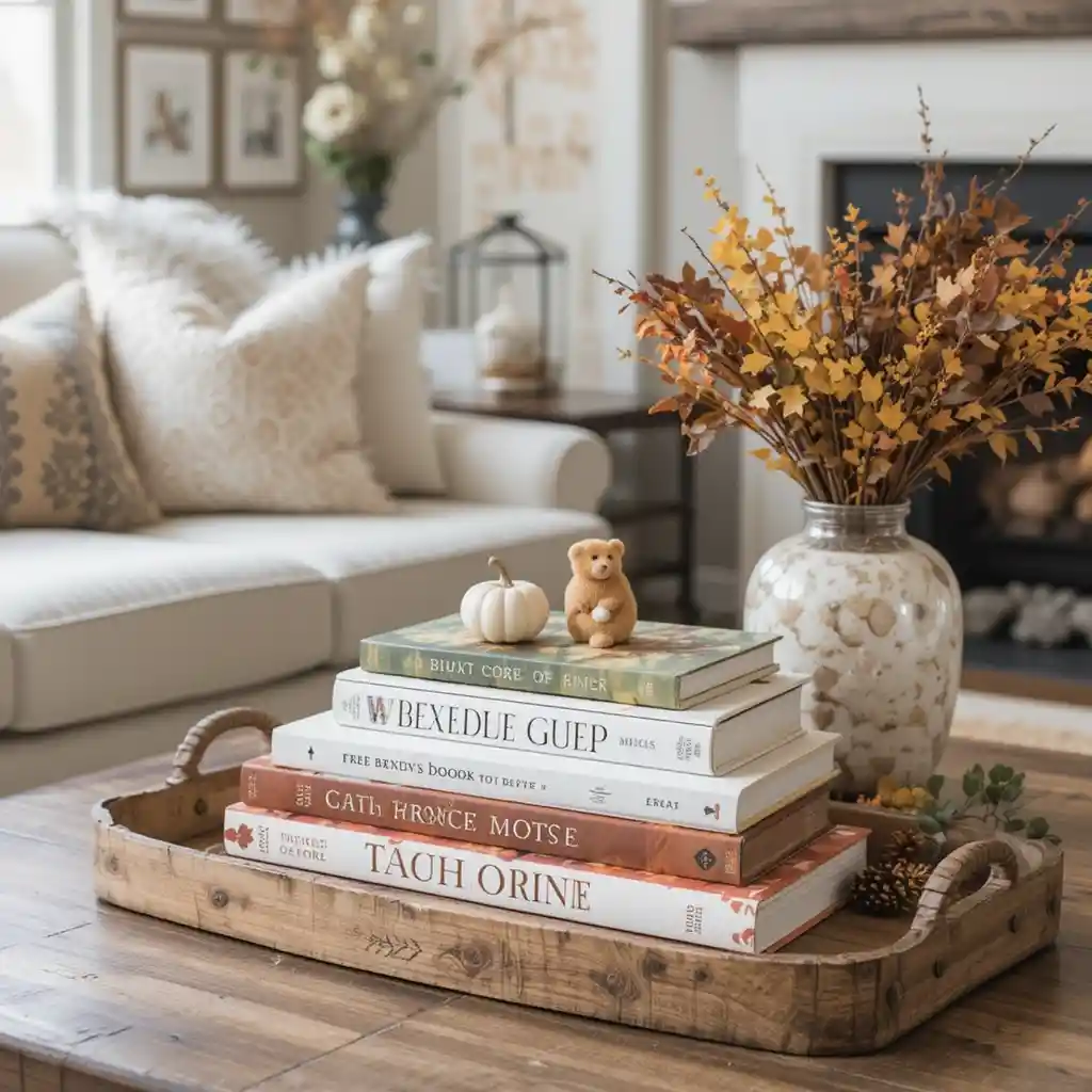 Stack coffee table books with autumn themes, rustic trays, and seasonal trinkets to subtly tie the whole fall living room aesthetic together.