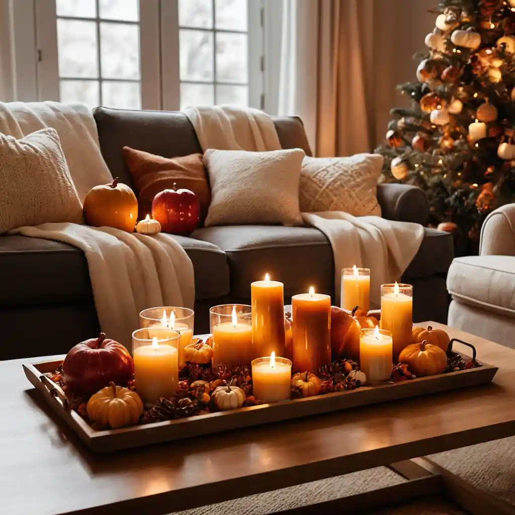 Scented candles with fall fragrances like cinnamon, apple, and vanilla add warmth while creating a soothing, cozy atmosphere in the evenings.