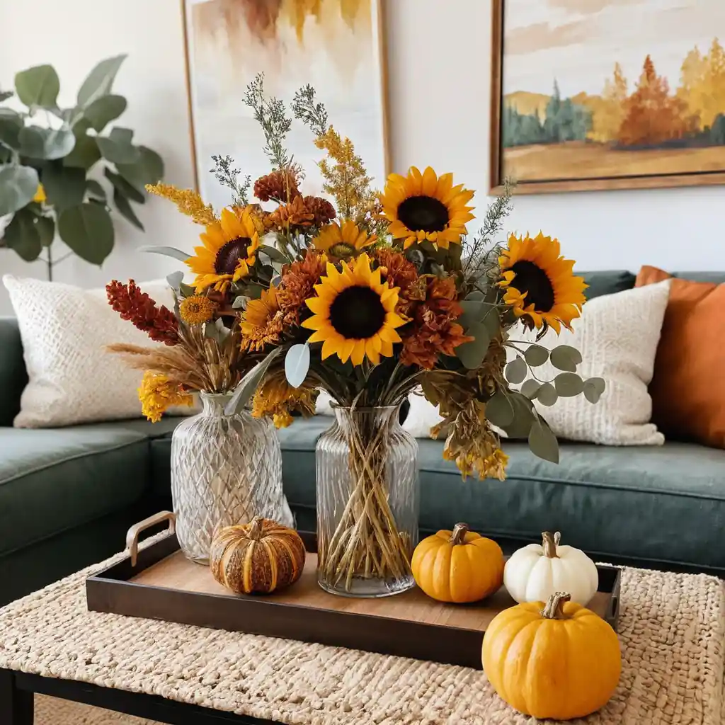 Fresh or dried flowers like sunflowers, marigolds, and eucalyptus look stunning in vases. They bring vibrant fall tones and natural beauty indoors.