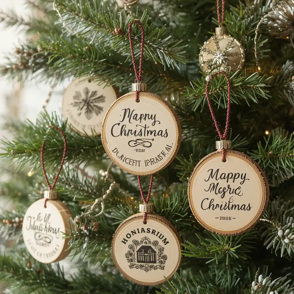 Create or buy ornaments made from wood slices stamped with festive sayings. This budget-friendly idea feels personal and rustic.