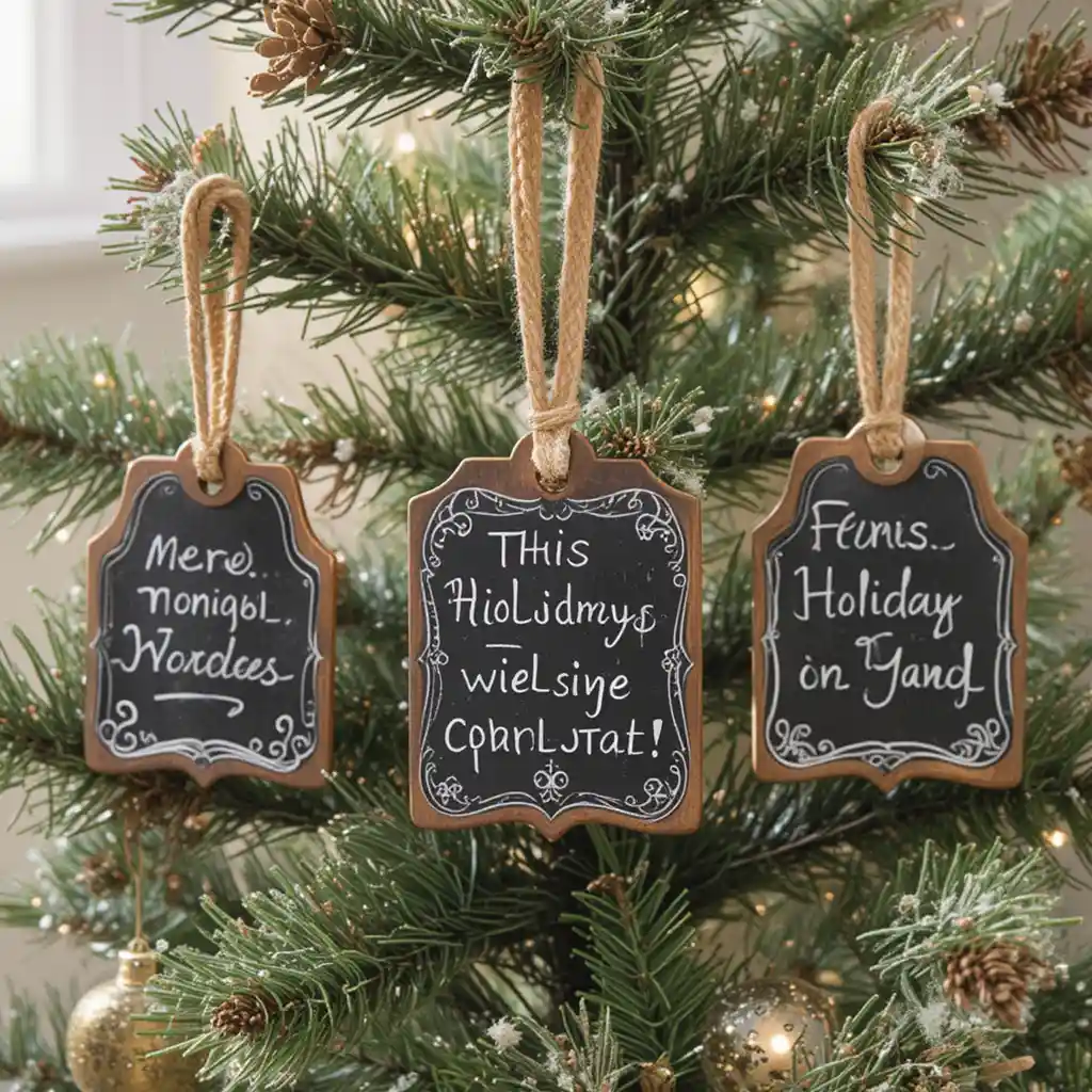 Mini chalkboard tags with handwritten notes make sentimental decorations. They allow family members to write holiday wishes and memories.