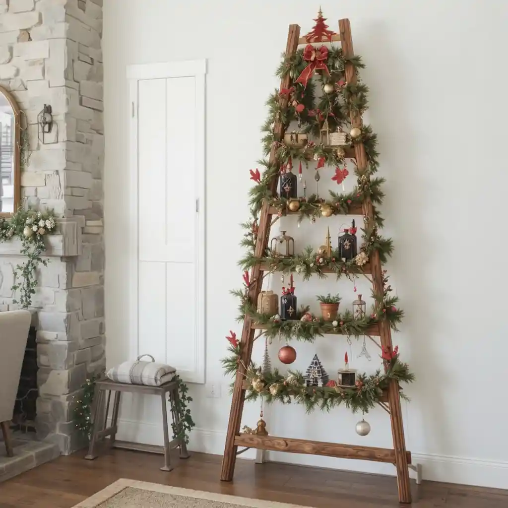 For a unique 2025 twist, decorate a wooden farmhouse ladder as a Christmas “tree.” Add greenery, lights, and ornaments for a bold, creative display.