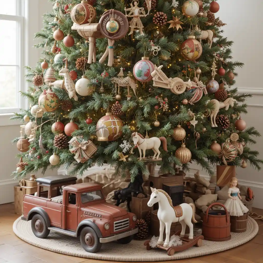 Place antique toy trucks, rocking horses, or dolls near the base. They bring nostalgic farmhouse traditions to life while charming younger guests.