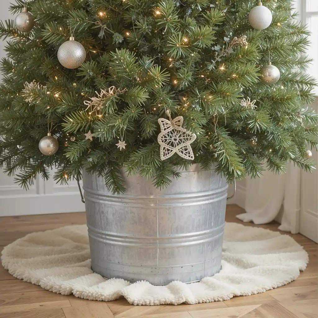 Swap the traditional tree skirt for a galvanized metal bucket or tub. This rustic base grounds your tree in authentic farmhouse flair while keeping it neat and stylish.