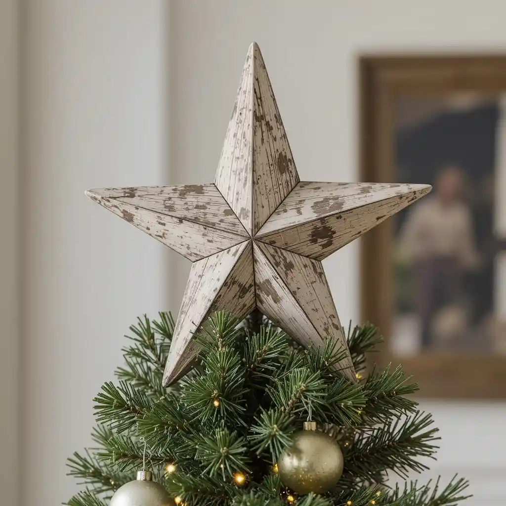 Trade in the usual angel or glitter topper for a distressed wooden star. It adds a handcrafted touch that feels true to farmhouse living.