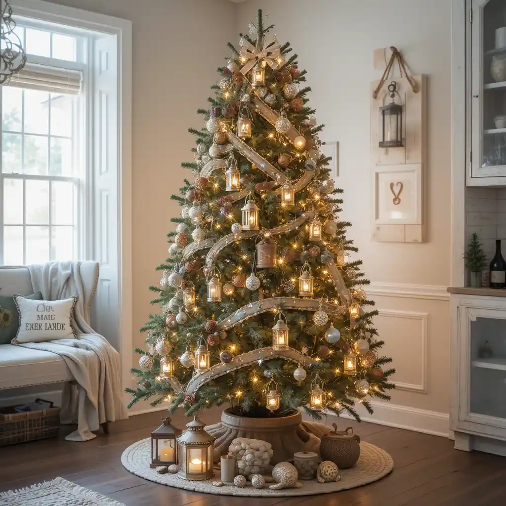 Hang miniature lantern ornaments or tuck rustic lanterns at the tree’s base. The glow of candlelight enhances the cozy farmhouse atmosphere.