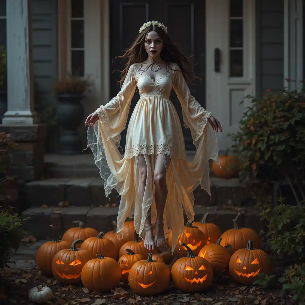 Position the floating girl above a circle of carved pumpkins. The contrast of fun jack-o-lanterns with a horrifying floating figure creates a dramatic scene.
