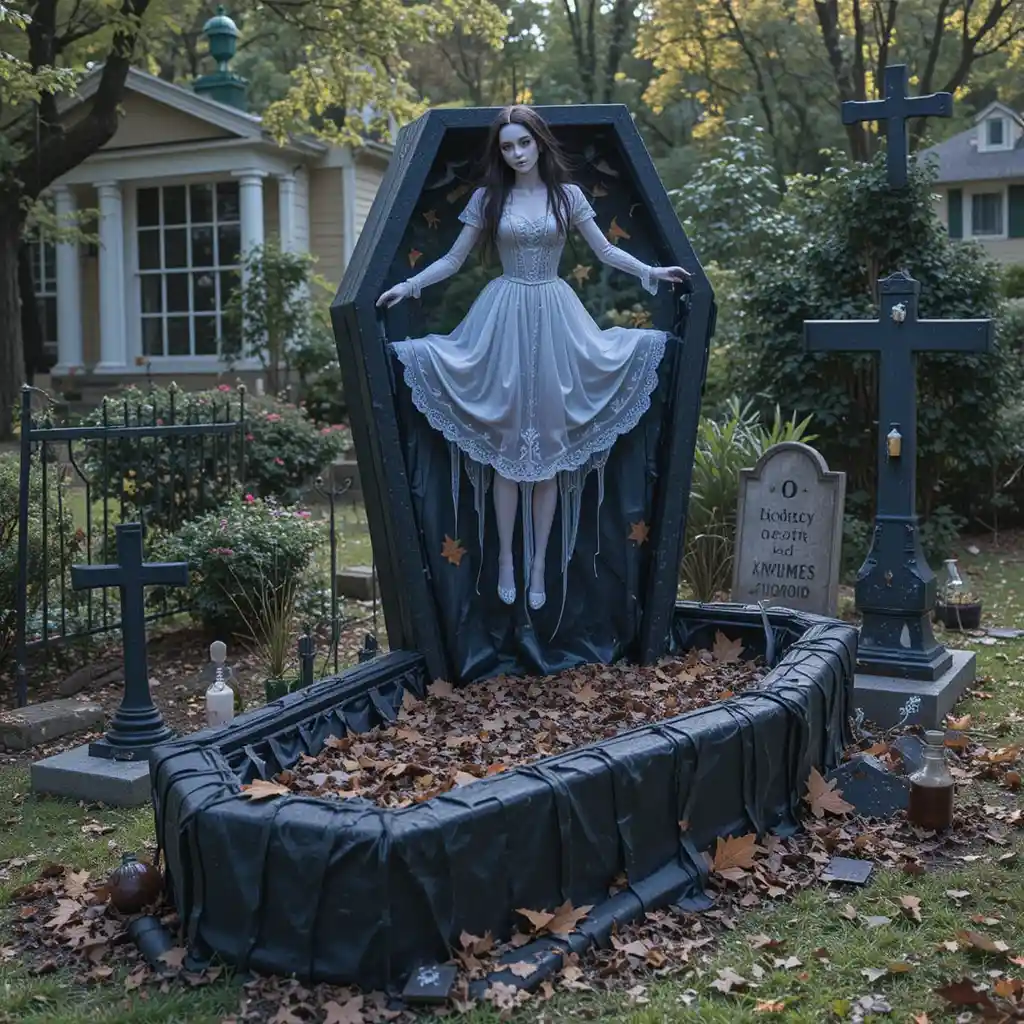 For an unforgettable yard display, design a half-open coffin with a floating girl hovering just above it. This adds an unexpected twist to the traditional graveyard décor.