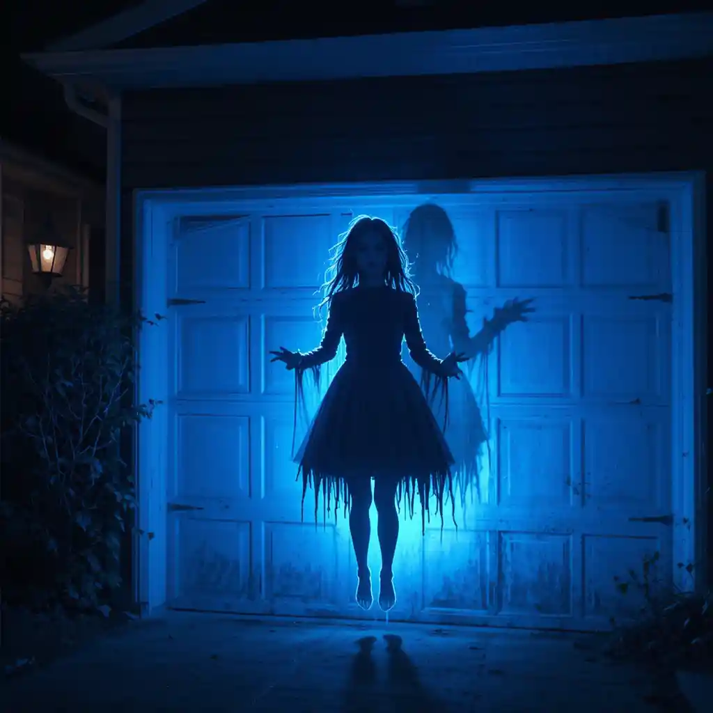 Use a backlight to cast a haunting shadow silhouette of the floating girl against your house or garage wall. The glowing outline looks terrifying from a distance.