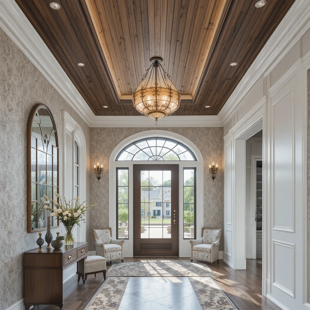 Ceilings are no longer overlooked. Wooden slats, subtle wallpaper, or recessed lighting designs add depth. This unexpected detail elevates Foyer Decoration Ideas 2026 and makes the entryway feel intentionally designed.