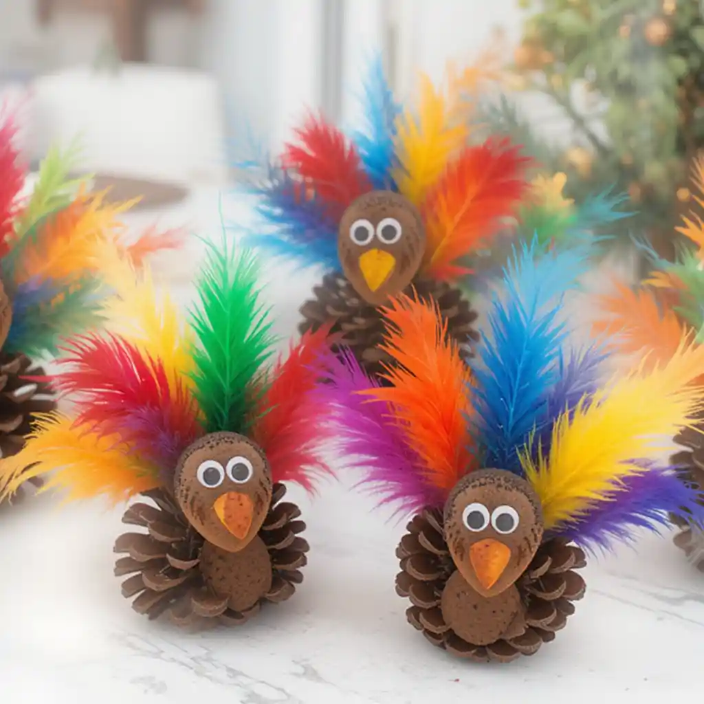 Kids can glue colorful feathers onto pinecones to make adorable turkey decorations. Place them on the dining table or mantel for a playful Thanksgiving vibe.