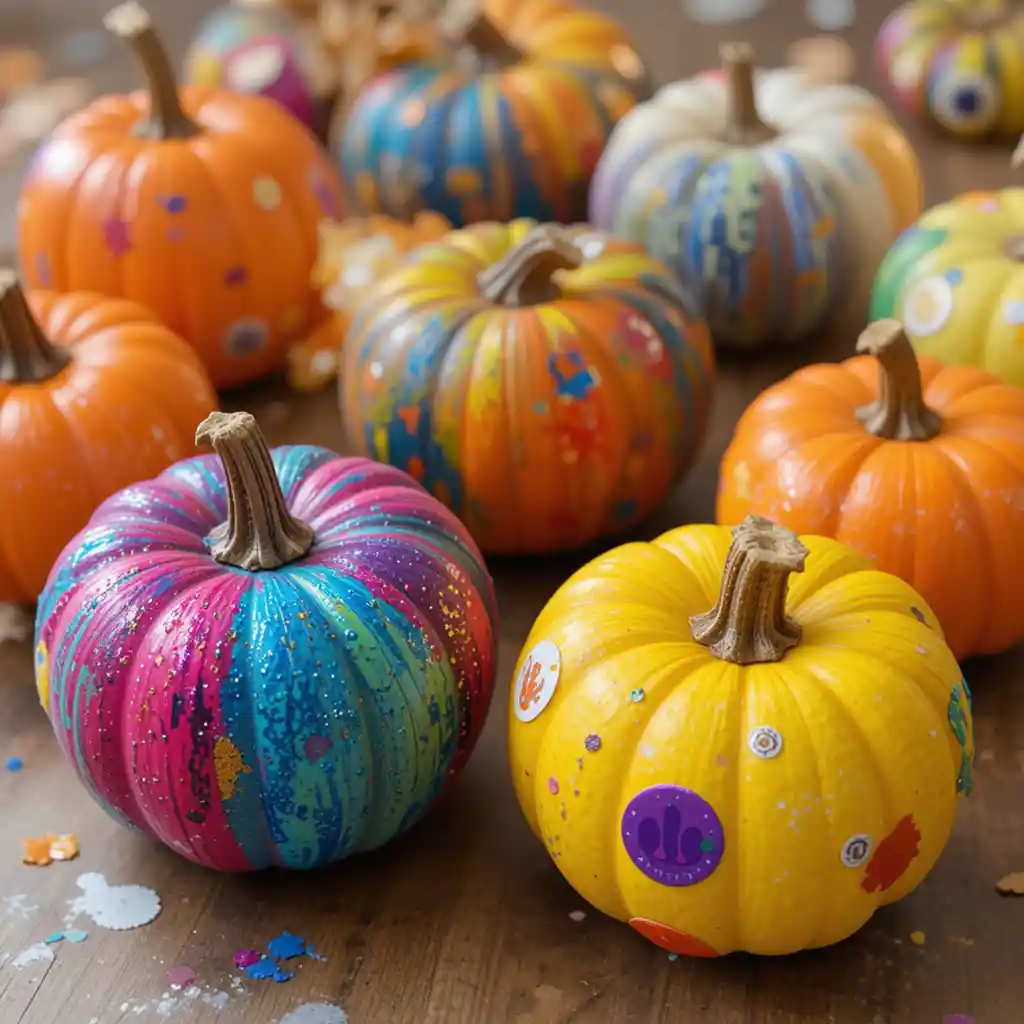 Instead of carving, let kids paint small pumpkins with bright colors, glitter, or stickers. These painted pumpkins become cheerful décor for any room.