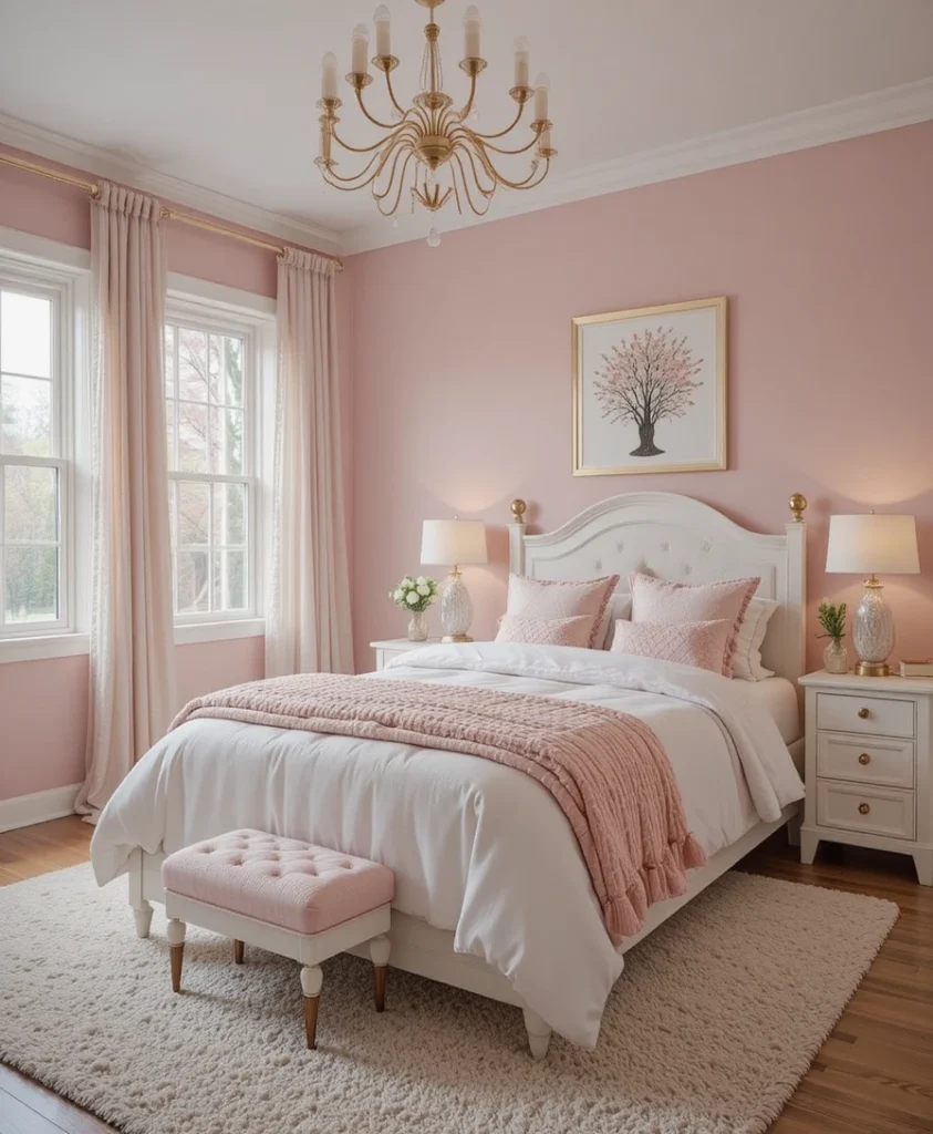 A modern take on a classic palette, powder pink with white feels fresh and timeless. The softness of this combination makes the room feel light, airy, and comforting while remaining visually appealing.