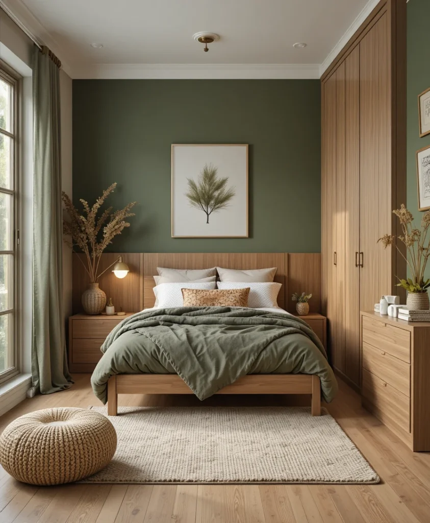Olive green paired with natural wood tones creates an earthy, grounded bedroom. This palette promotes calmness and connection to nature, a core theme in contemporary interior design for 2026.