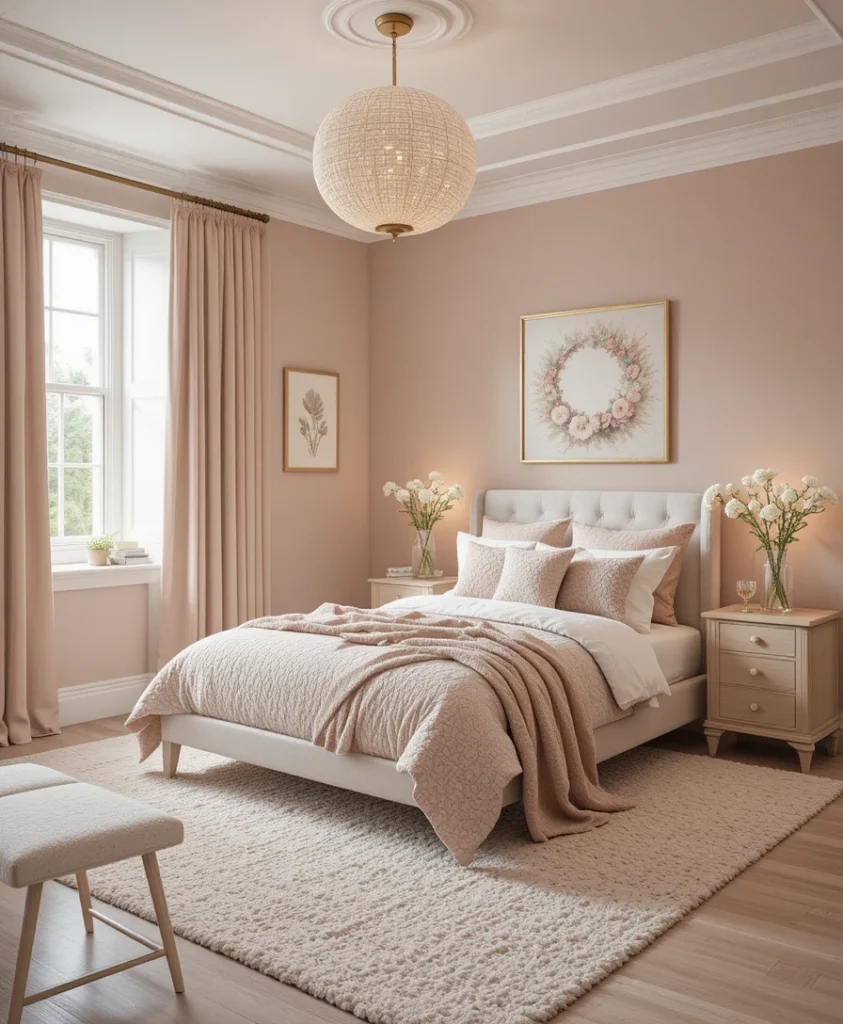 Rose beige blends warmth and softness into a cohesive palette that feels comforting yet trendy. It works beautifully with textured fabrics and layered lighting for a cozy, personalized bedroom look.