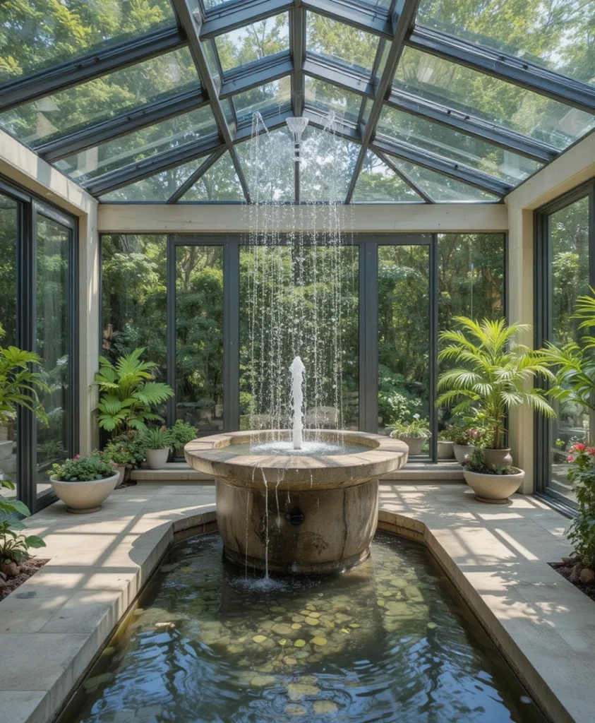 Adding a small fountain or reflective water element introduces tranquility. The interplay of glass, light, and water feels luxurious and calming. These glass sunroom ideas 2026 focus on sensory relaxation. Ideal for stress-free living environments.