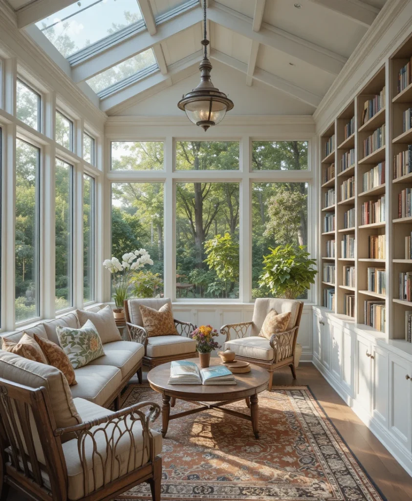 Soft seating, layered lighting, and panoramic glass create a reader’s paradise. Natural daylight enhances focus and comfort. These glass sunroom ideas 2026 prioritize peaceful solitude. Built-in shelving keeps the space organized and serene.