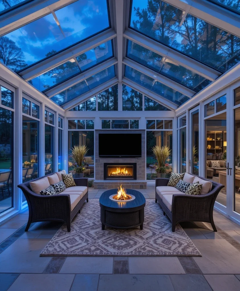 Adding a modern fireplace instantly turns a glass sunroom into a year-round luxury space. Enclosed glass panels retain warmth while offering outdoor views during colder months. This is one of the most elegant glass sunroom ideas 2026 for those seeking comfort and style. Choose linear fireplaces for a contemporary aesthetic.