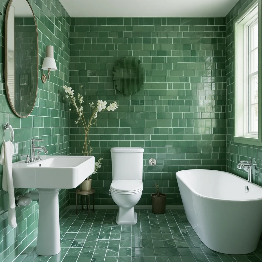 Balance green bathroom ideas with crisp white tiles or tubs for a timeless and clean aesthetic. The contrast creates dimension and emphasizes the soothing qualities of green.