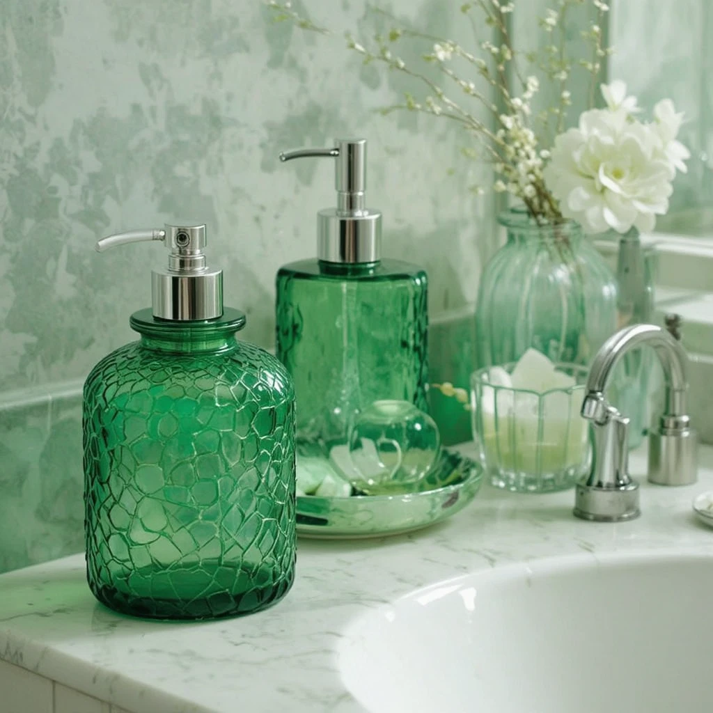 Use recycled green glass soap dispensers, jars, or light fixtures to emphasize sustainability. This subtle nod to eco-conscious living enhances your green bathroom theme stylishly.