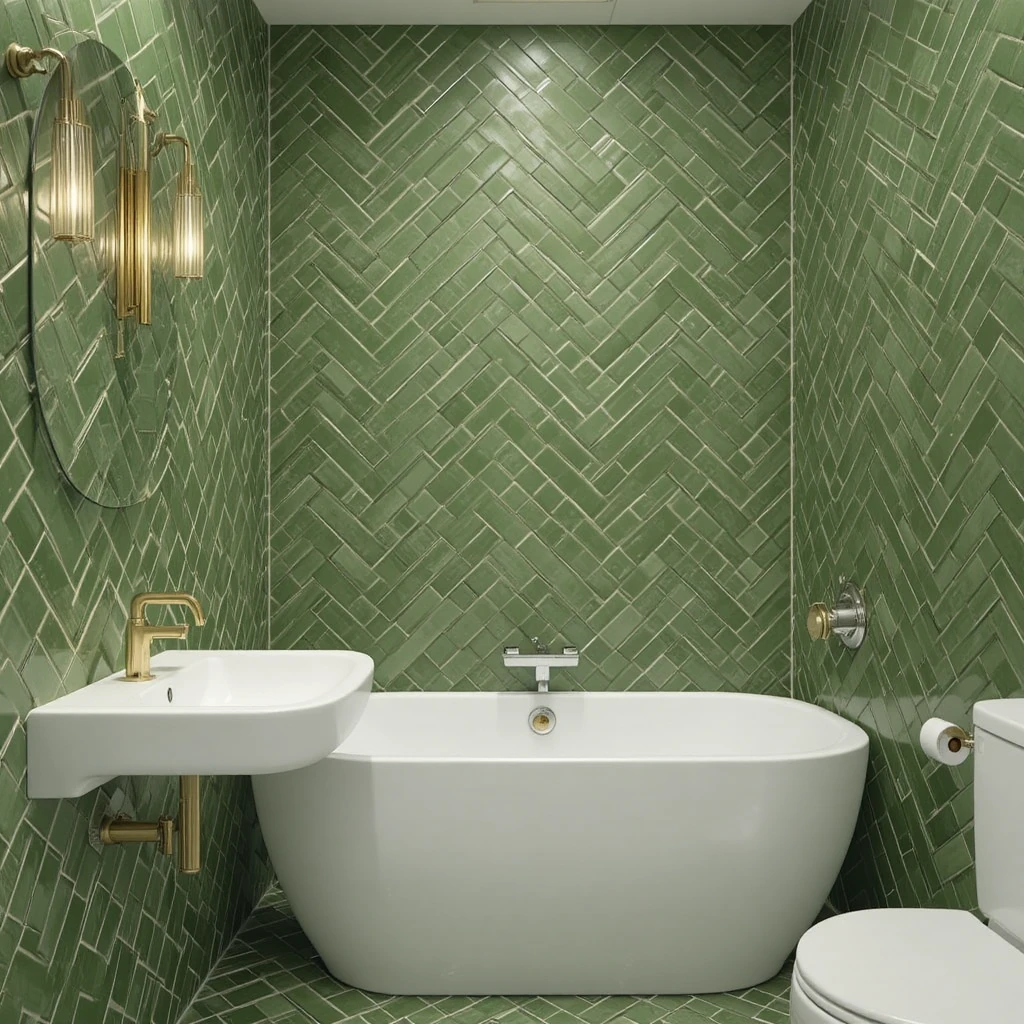 Use herringbone-patterned green tiles for your shower area or backsplash. The dynamic layout adds motion and character while keeping the look elegant and structured.