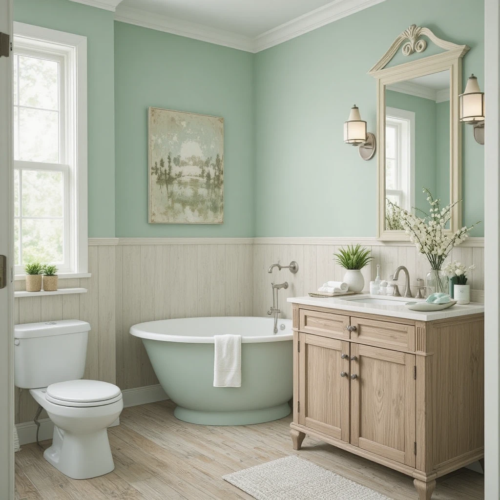 Light mint green walls make a bathroom feel airy and youthful. This pastel shade brightens the room, reflecting sunlight beautifully while keeping the environment soft and refreshing.