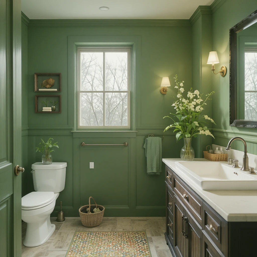 Choose eco-friendly green paints made from low-VOC materials. They’re safe, sustainable, and align perfectly with the natural essence of a green bathroom design.