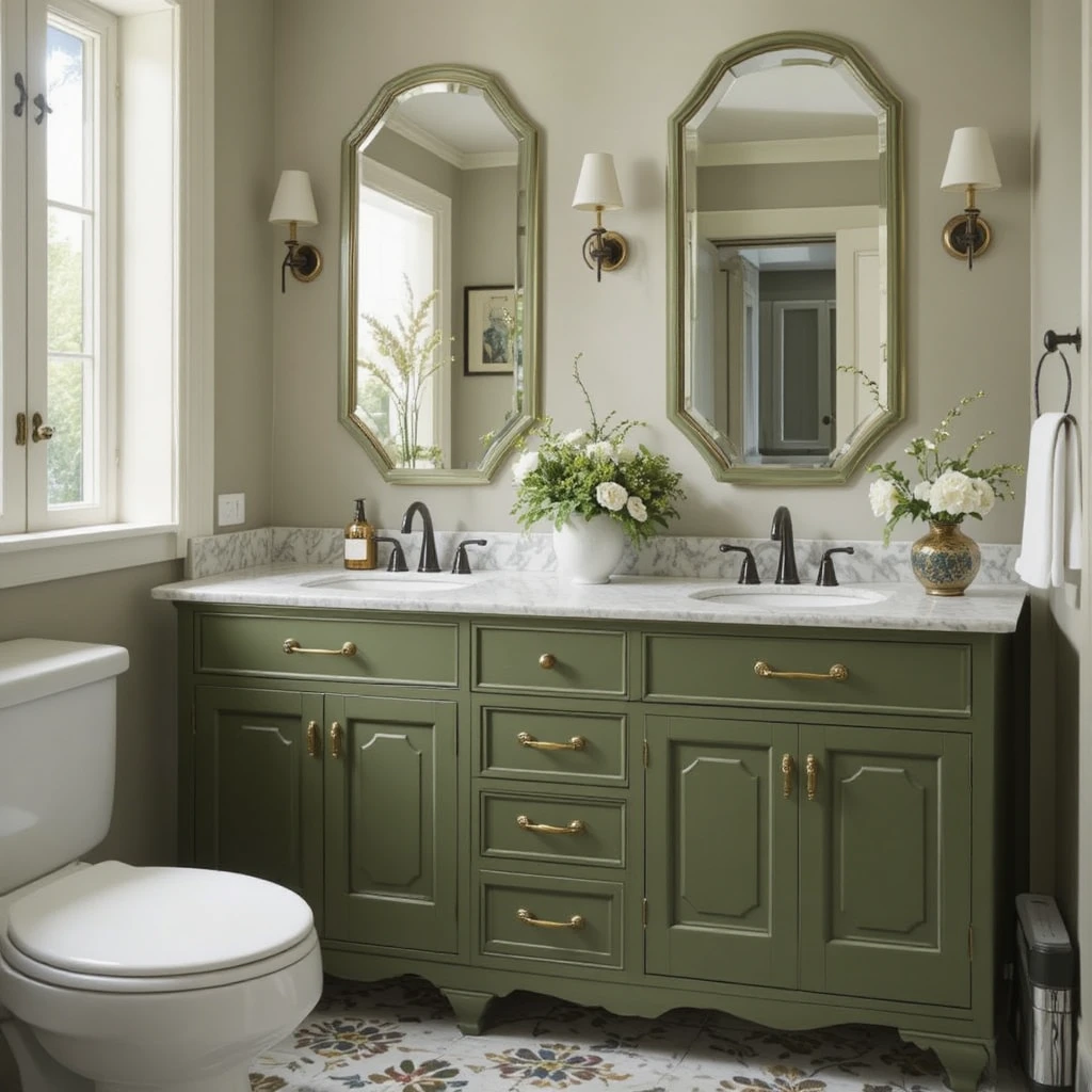 An olive green vanity adds warmth and personality to your bathroom. Pair it with gold handles or black hardware for a refined look that feels both earthy and elegant.