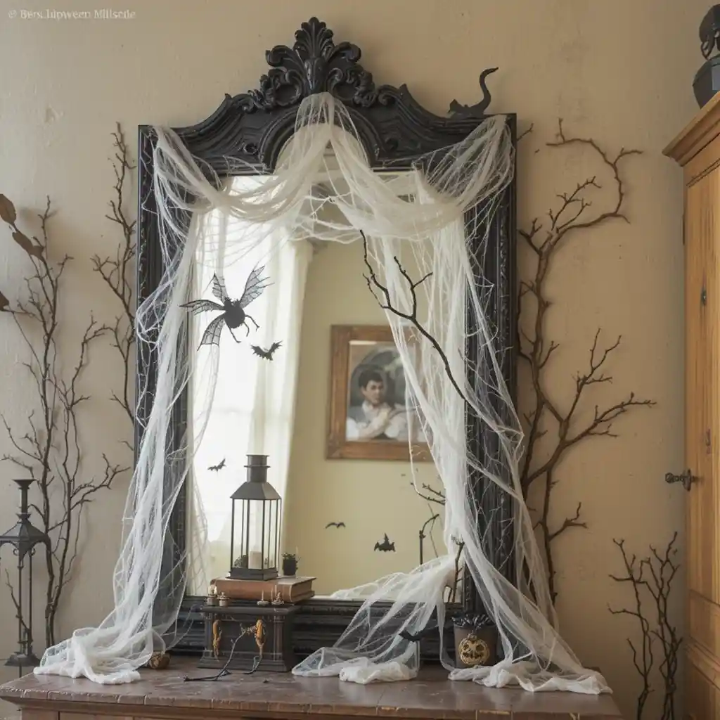 Lean a decorative mirror against the cabinet backdrop and add cobwebs or creepy decals. It creates an illusion of depth and gives your cabinet a haunted house feel.