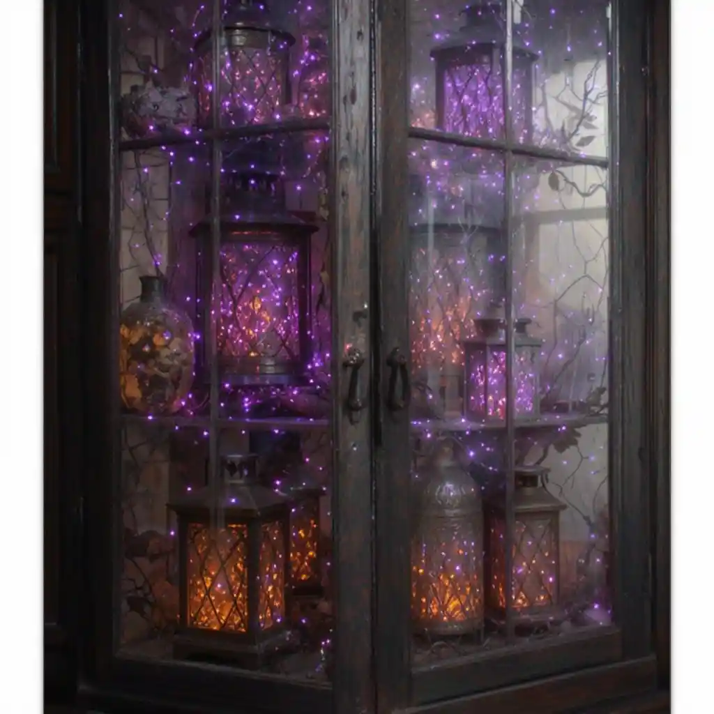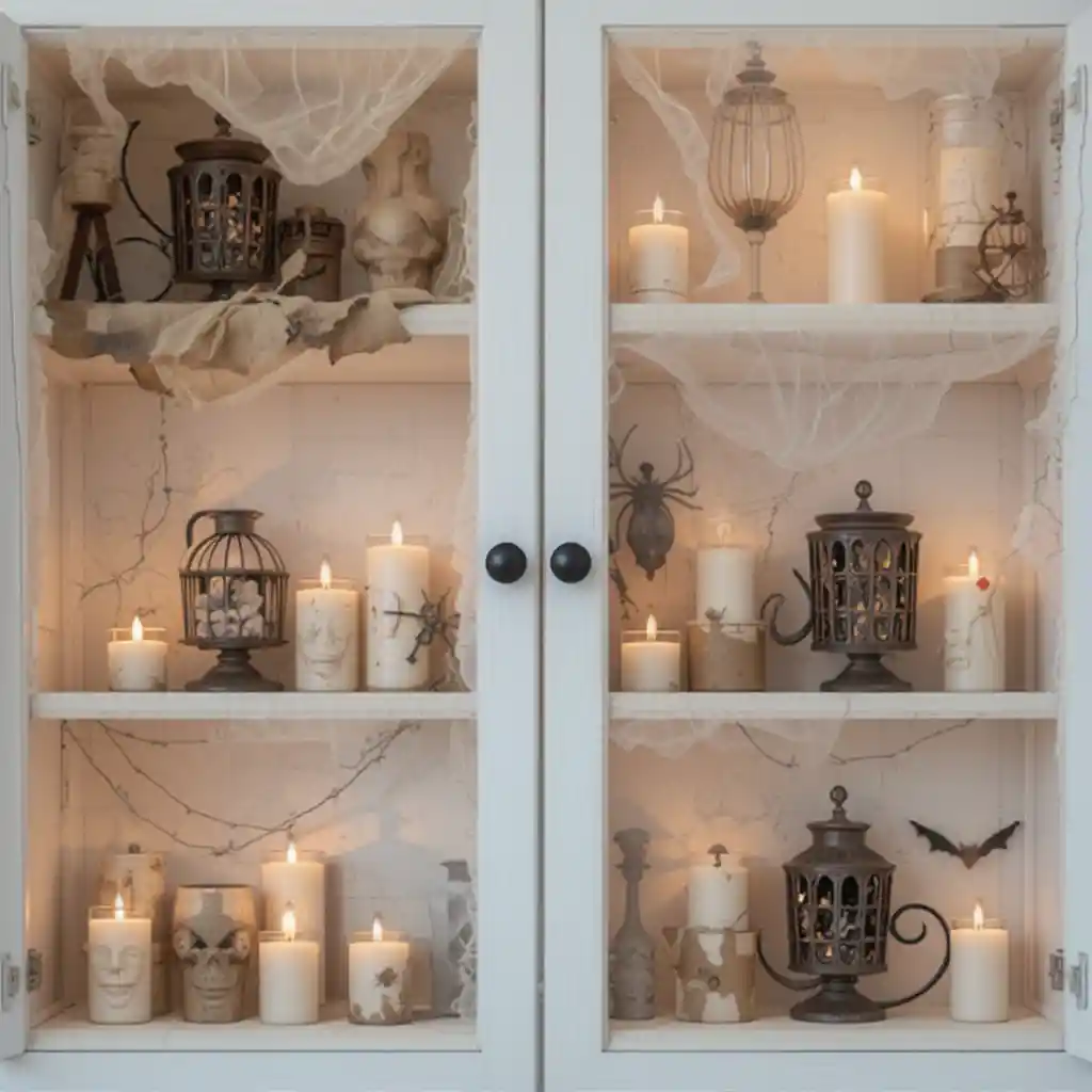Use flameless candles of varying heights across your cabinet shelves. Their flickering glow adds a spooky yet safe touch to your Halloween setup.