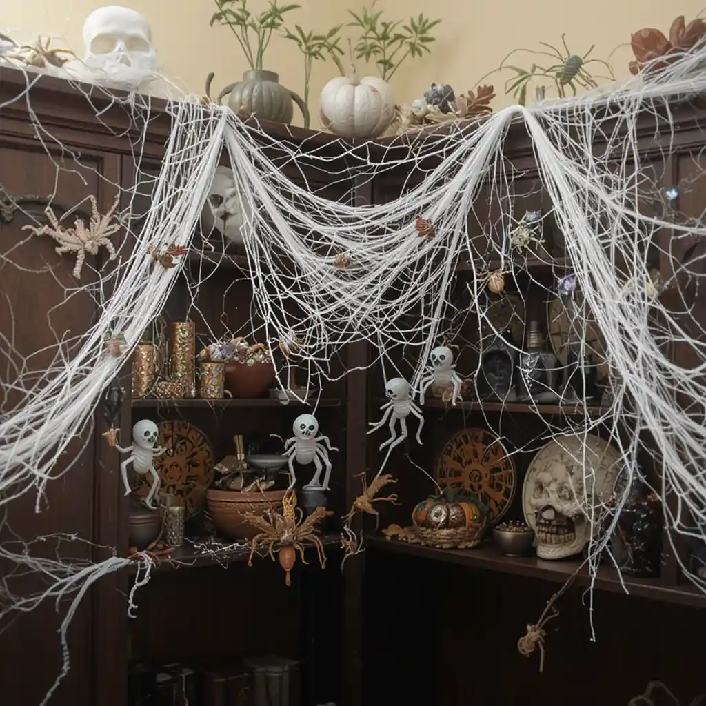 Stretch white webbing across your cabinet corners and shelves. Place small creepy crawlies inside the webs to make it look realistic without overdoing the scare.