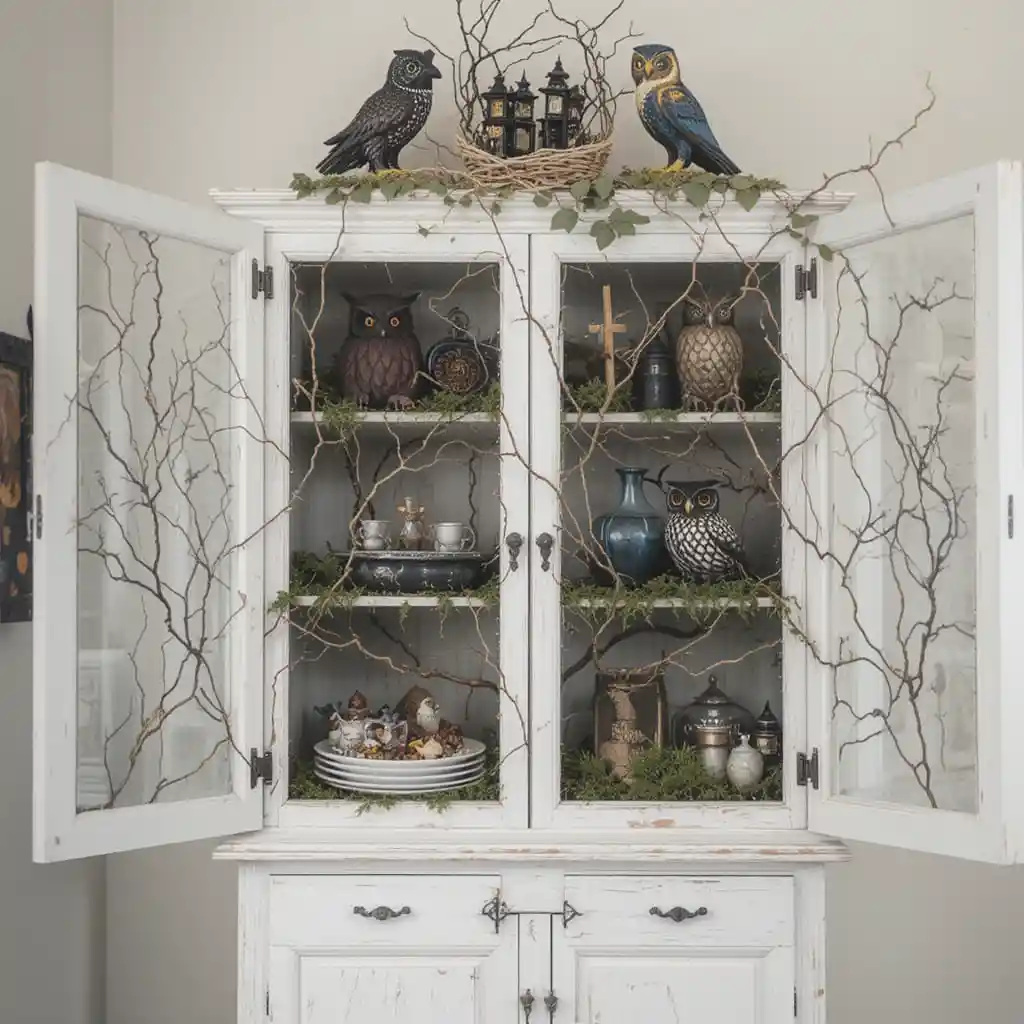 Perch artificial owls or ravens on top of cabinets or inside shelves. Pair them with branches and faux moss to give the display a spooky forest feel.