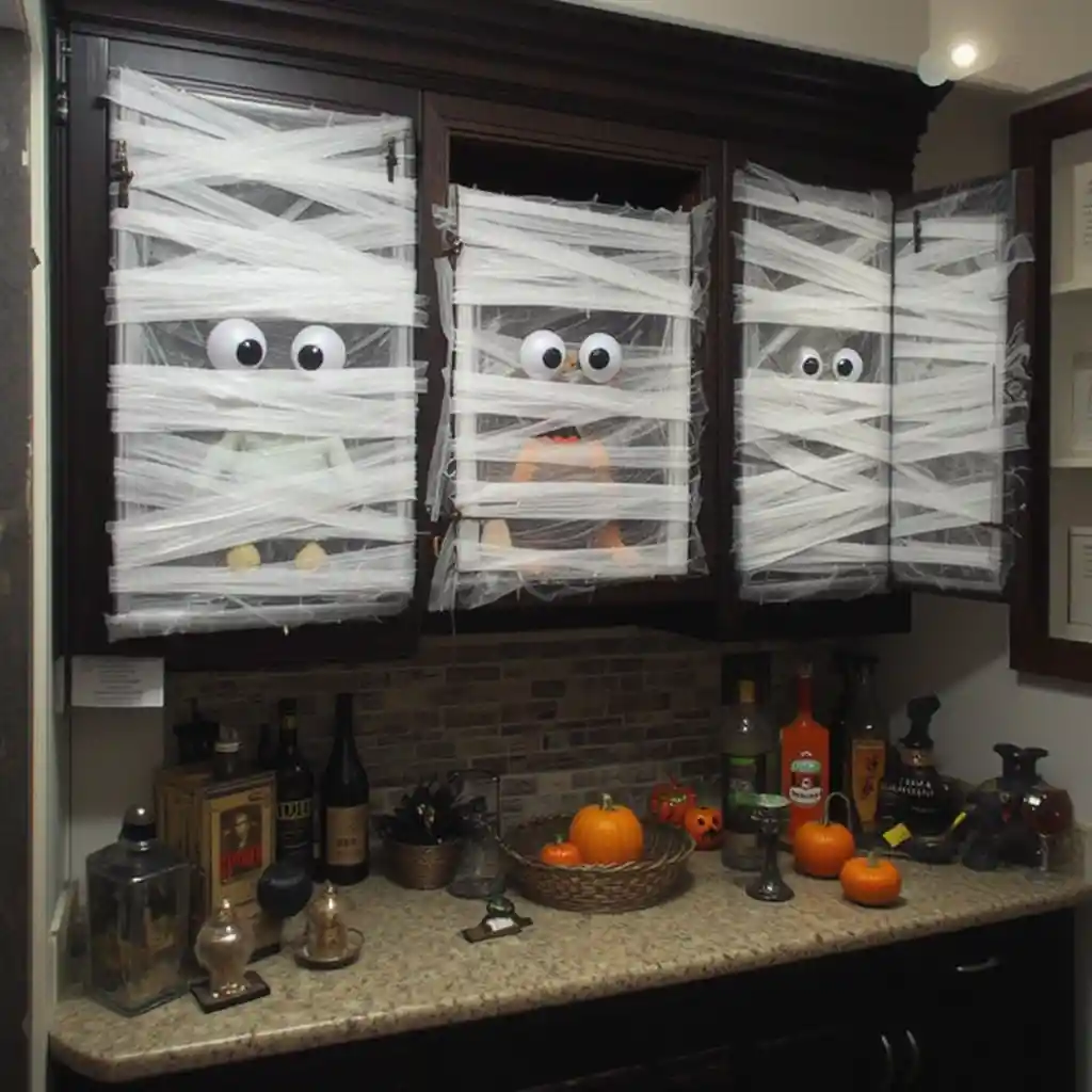 Wrap your cabinet doors with strips of white cloth or gauze, leaving space for googly eyes to peek out. It’s fun, creative, and kid-approved.