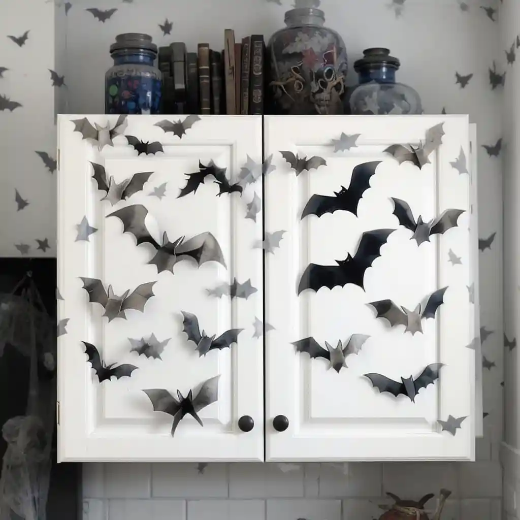 Cover your cabinet doors with a flock of black paper bats flying upward. It’s simple, inexpensive, and instantly makes your space look spookier.