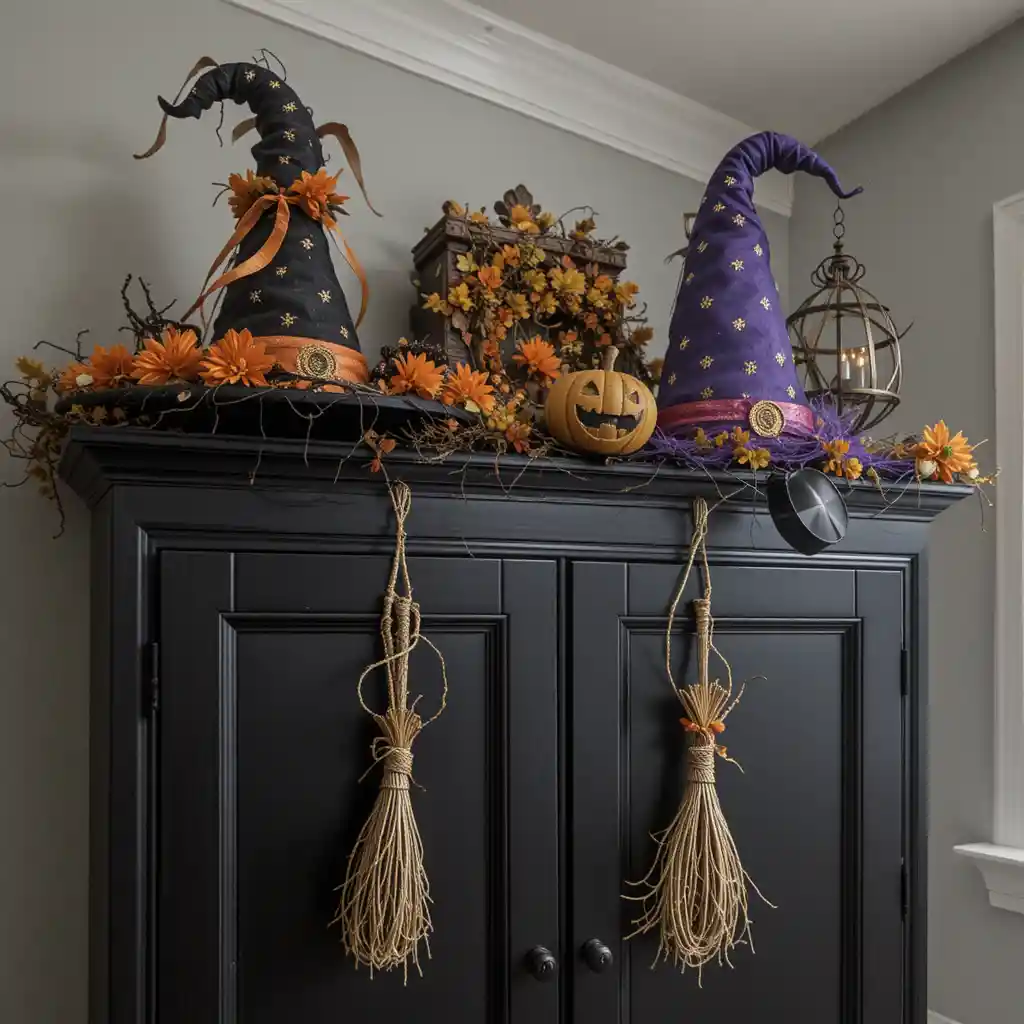 Place witch hats on top of your cabinets or hang small versions on the knobs. Pair them with broomstick décor for a fun magical theme.