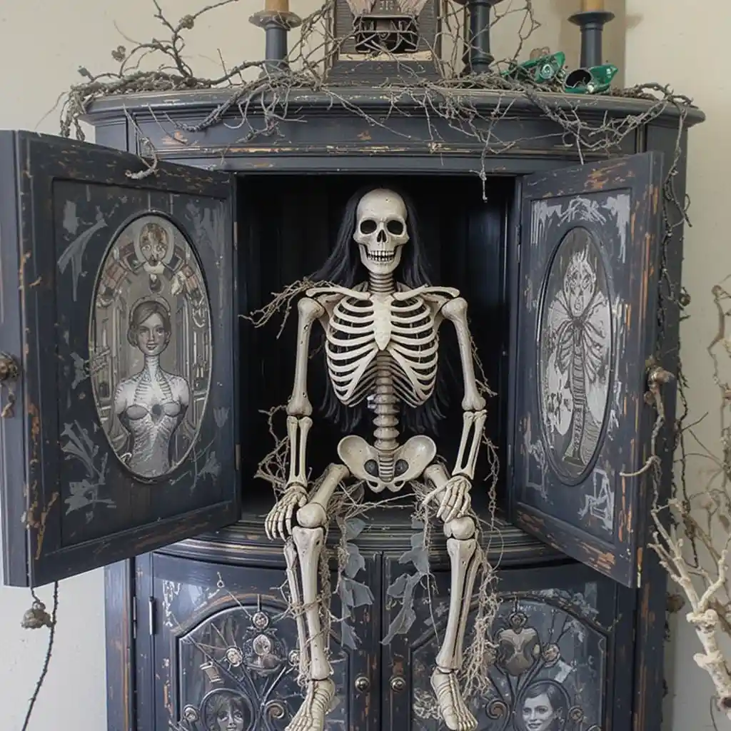Pose a skeleton figure sitting on top of your cabinet or peeking from inside. Add small bone ornaments for extra creepy details.