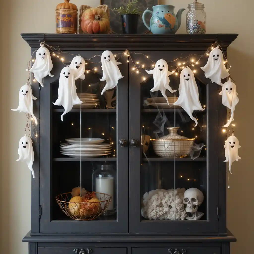Hang a garland of smiling ghosts across the front of your cabinet. White fabric ghosts paired with fairy lights make the display fun for kids and guests alike.